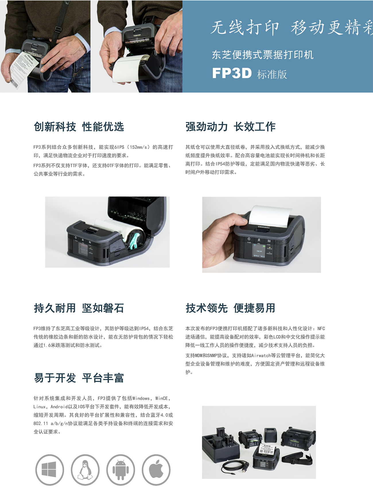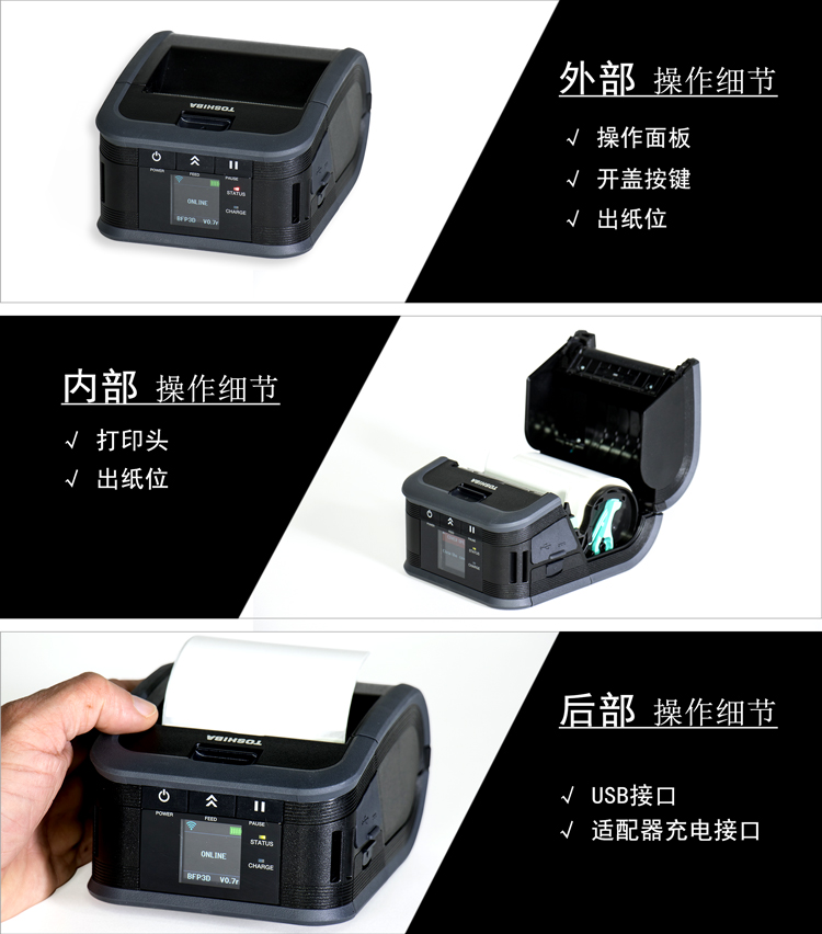 東芝將高性能移動(dòng)打印技術(shù)帶到你的手中,F(xiàn)P3D標(biāo)準(zhǔn)版3寸便攜式熱敏打印機(jī),擁有6IPS(152mm/s)高速打印、彩色中文液晶屏等技術(shù),蘊(yùn)含著東芝對(duì)于便攜性、可靠性和高性能的承諾,滿足各類便攜打印的應(yīng)用需求。