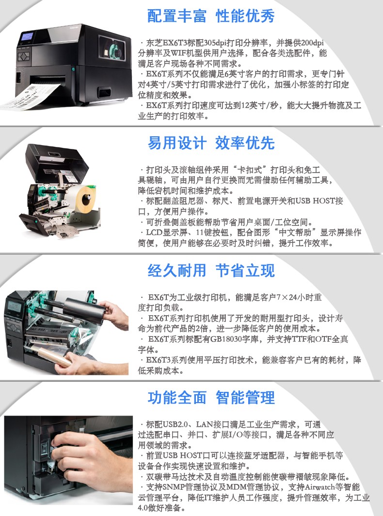具有12IPS打印速度、結(jié)合打印溫度和步進(jìn)控制技術(shù),能滿足各類標(biāo)簽打印的需求,懸壓打印技術(shù)和碳帶節(jié)省功能,能降低客戶使用成本,提升投資回報(bào)率。EX6T3堅(jiān)固耐用,擁有平壓打印及居中打印技術(shù)的同時(shí),結(jié)合多種人性化、智能化設(shè)計(jì),提供寬幅工業(yè)標(biāo)簽打印應(yīng)用。廣泛的應(yīng)用領(lǐng)域:物流運(yùn)輸 / 制造 / 化工 / 鋼鐵 / 電力行業(yè) 聯(lián)系人:李先生 手機(jī):18929304946 陳小姐(業(yè)務(wù)):189293049